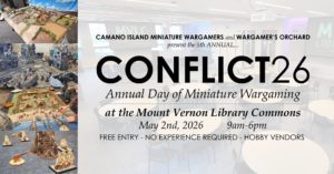 Join us for CONFLICT, a full day of tabletop battles, hobby camaraderie, and miniature wargaming on May 2nd at the Mount Vernon Library Commons. Best of all, this event is FREE TO ATTEND!